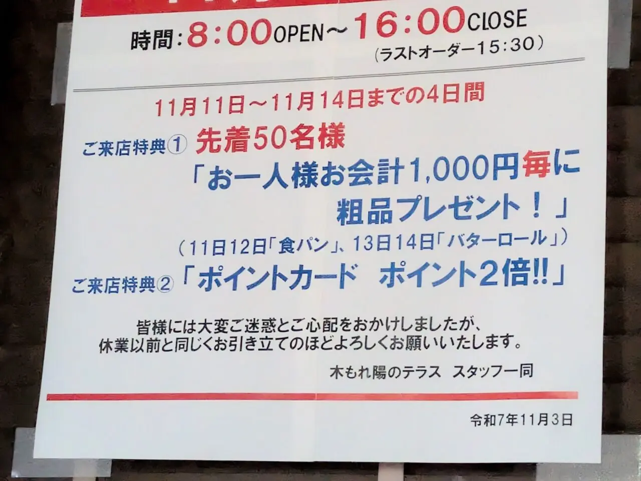 2025年11月11日から14日までの4日間、各日先着50名様限定で、お一人様お会計1,000円ごとにパンのプレゼントがもらえるそうですよ!