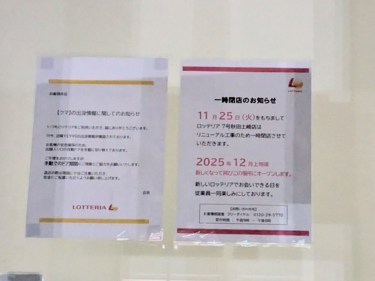 また、かつて秋田市内にあった「ロッテリア 秋田土崎イオン店」は2025年2月に閉店しており、今回の閉店によって秋田県内からロッテリアの看板は姿を消すことになります。
