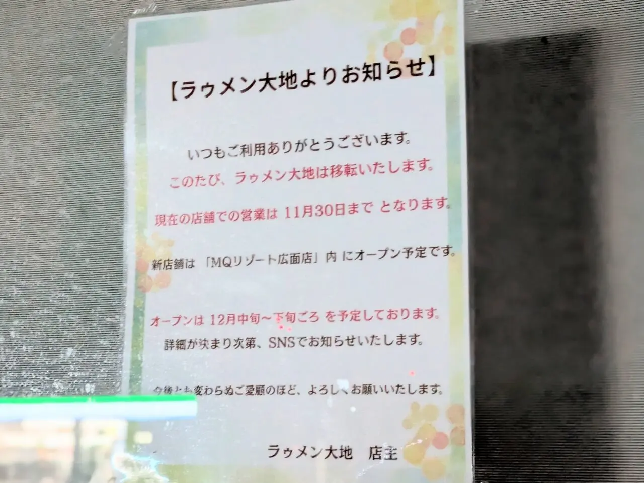 移転予定場所ではすでに「ラゥメン大地」の看板も出ていましたよ。