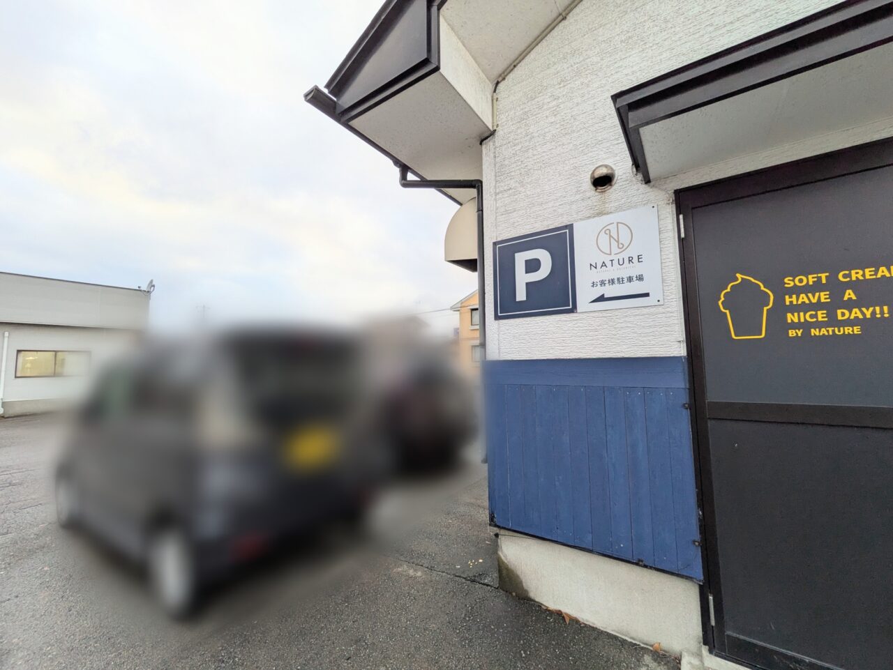 駐車場は、建物裏にお隣の「そば処けん太」さんなどと共用の駐車スペースがありますよ。