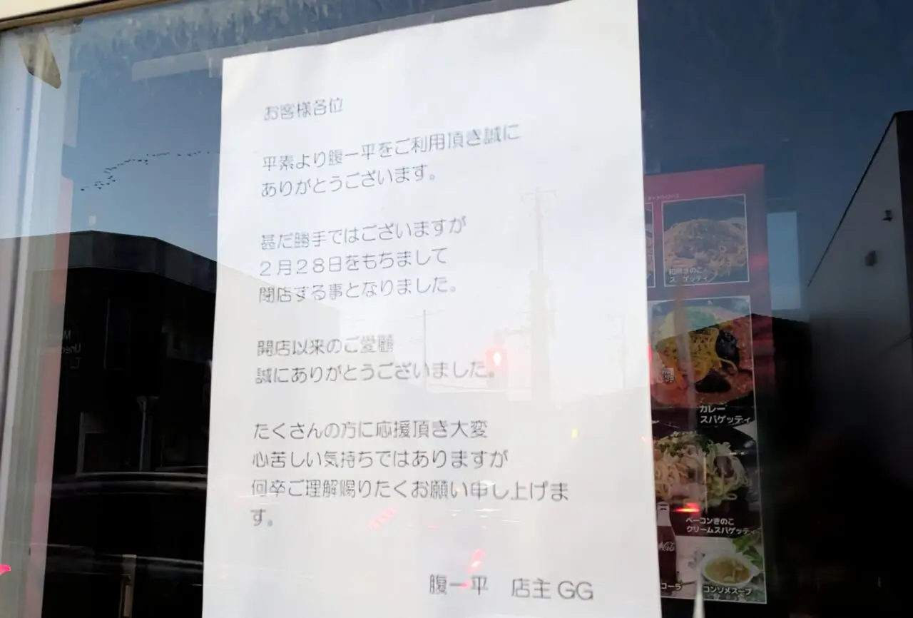 秋田市手形にあるスパゲッティ専門店「腹一平 手形店」が、2026年2月28日をもって閉店するそうです。