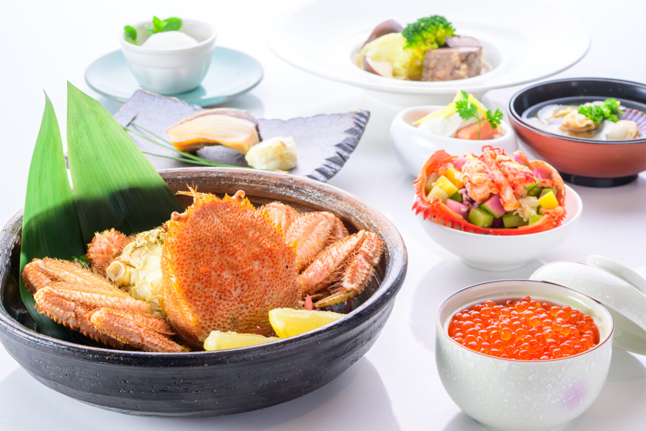 夕食付きプランでは、寿司会席や毛蟹を含む和洋ディナー、さらに上位プランでは北海道三大カニを味わえる特別会席も用意されています。