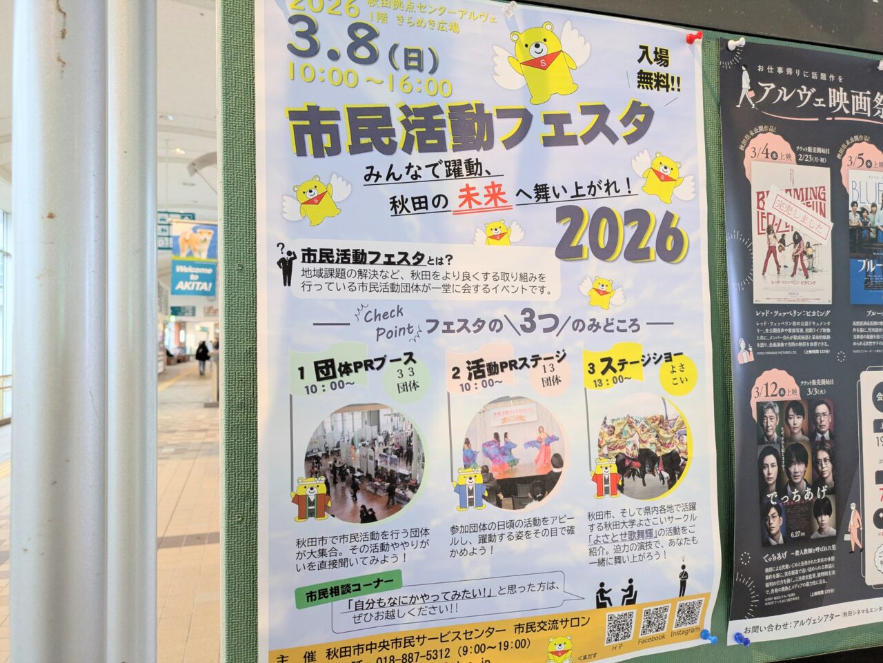 会場は秋田駅東口にある秋田拠点センターアルヴェ1階きらめき広場で、入場は無料です。