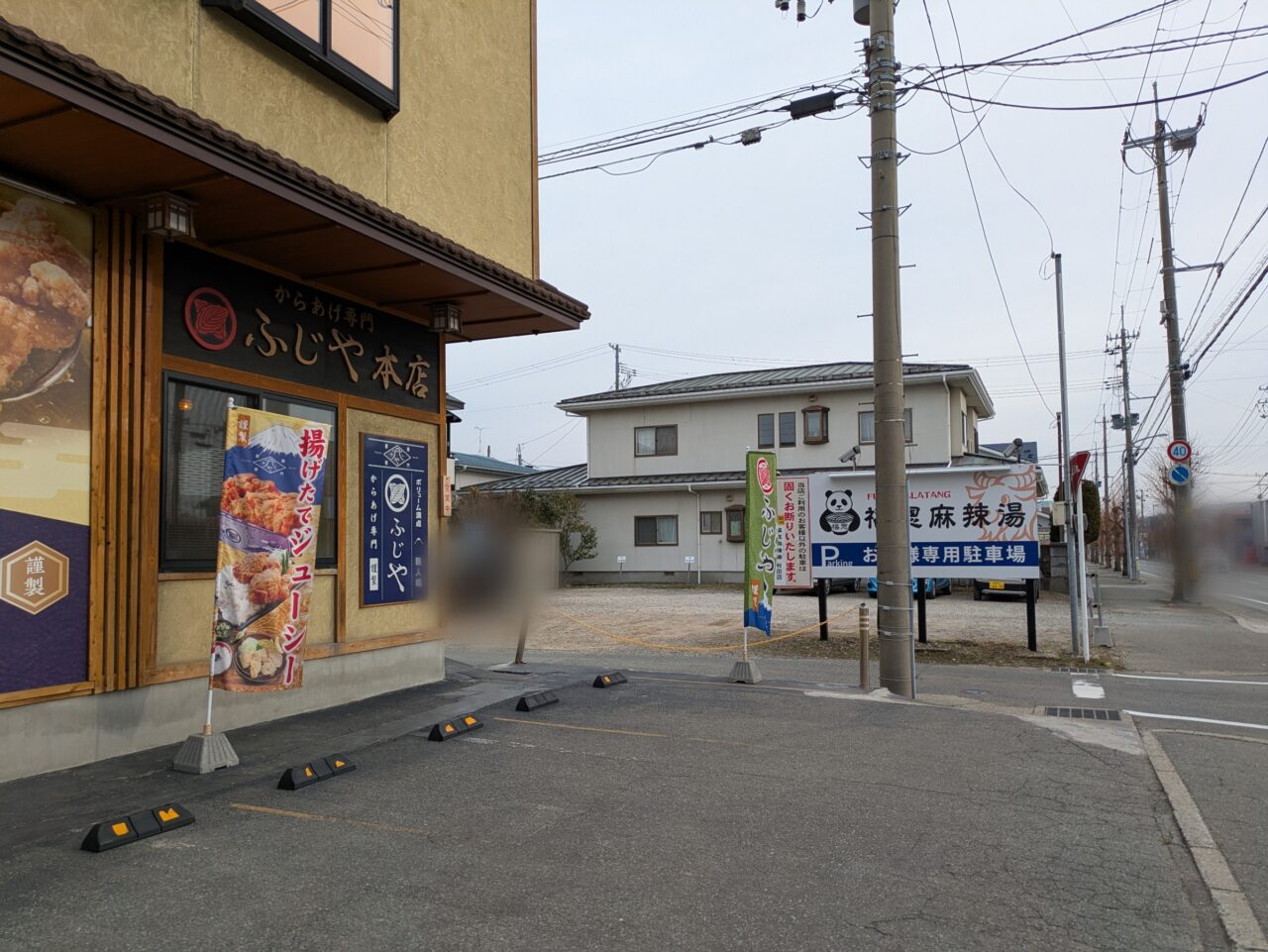 店舗の裏手には、ふじやからあげ本店の先に駐車スペースも用意されており、車での来店にも対応できる環境が整っています。