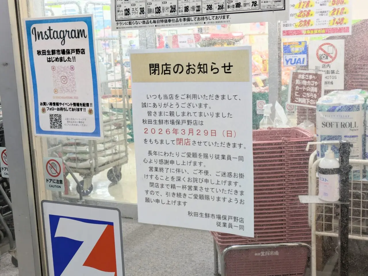 秋田市保戸野エリアで長年親しまれてきた「秋田生鮮市場 保戸野店」が、2026年3月29日をもって閉店する予定です。