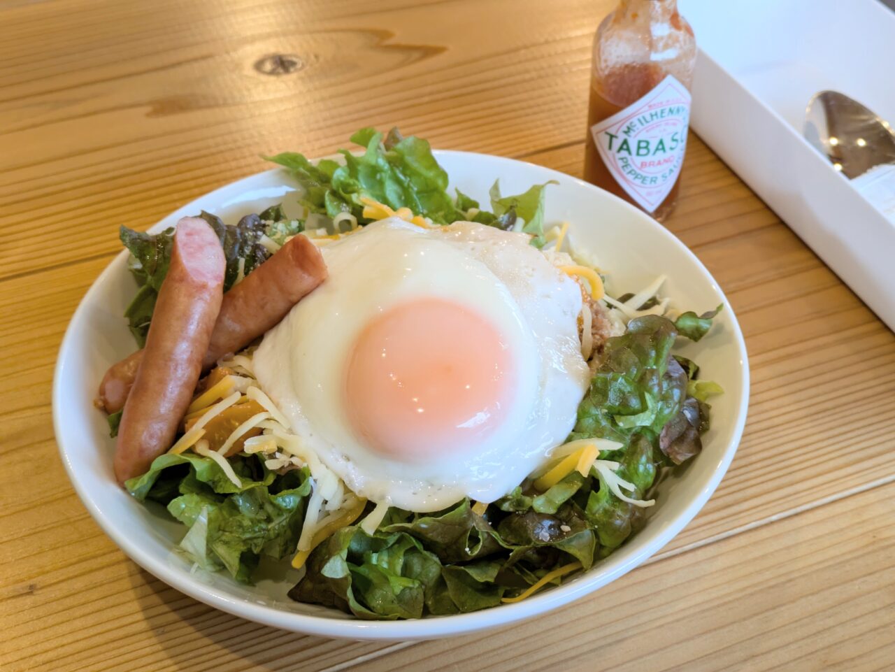 タコライスには、ウィンナーと目玉焼きをトッピング!しっかりとした味付けで、お肉の旨味が溢れる食べ応え抜群の一皿です。