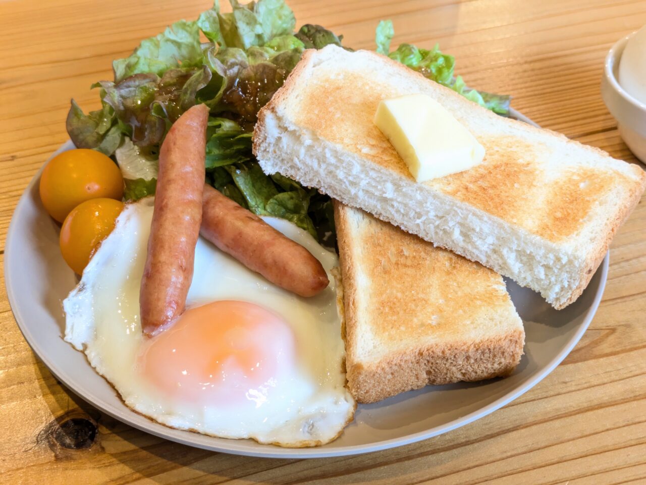 「基本のブランチプレート」(800円)は、トースト・サラダ・ミニトマト・ドリンクに加え、ウィンナー、目玉焼き、ゆでたまご、ヨーグルトの中から1品を選ぶスタイルです。