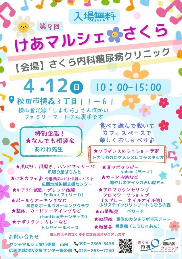 【秋田市】4/12にさくら内科・糖尿病クリニックで「第9回けあマルシェさくら」が開催されます!
